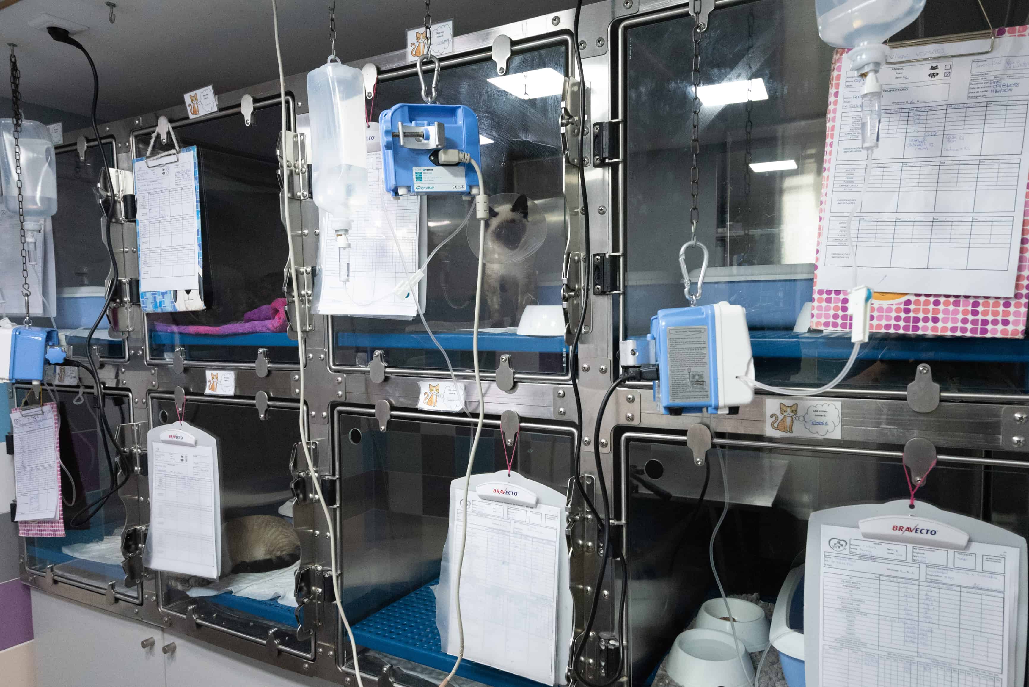 O internamento felino é independente do canino e está divido em zona de não infecciosas e zona de infecciosas. As boxes têm portas de vidro, fazem menos ruído e são comprovadamente mais confortáveis para a espécie felina. Toda a zona de internamento tem associada um vaporizador Feliway para manter os nossos patudos o mais relaxados possível. Os próprios revestimentos desta zona são pensados para evitar os sons prescindíveis e mantendo um ambiente calmo.